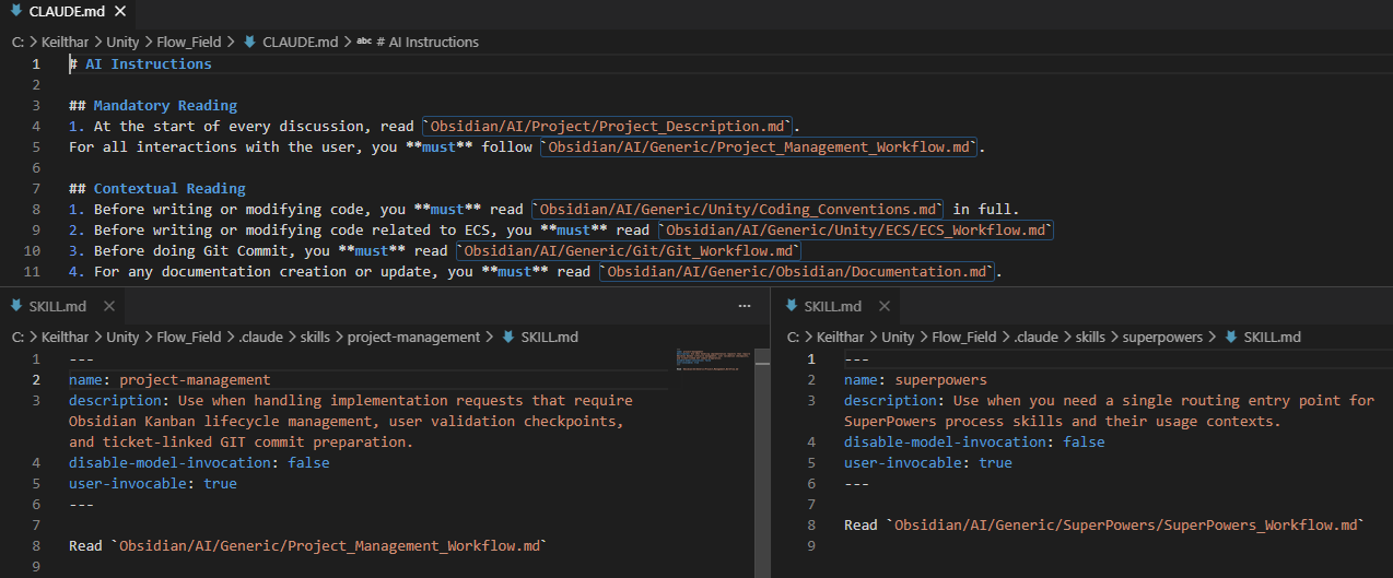 Ce que je vais vous prĂ©senter ici, câest donc un processus de gestion de projet via Obsidian, centralisĂ© dans la codebase et automatisĂ© par IA (applicable au game dev ou non) :