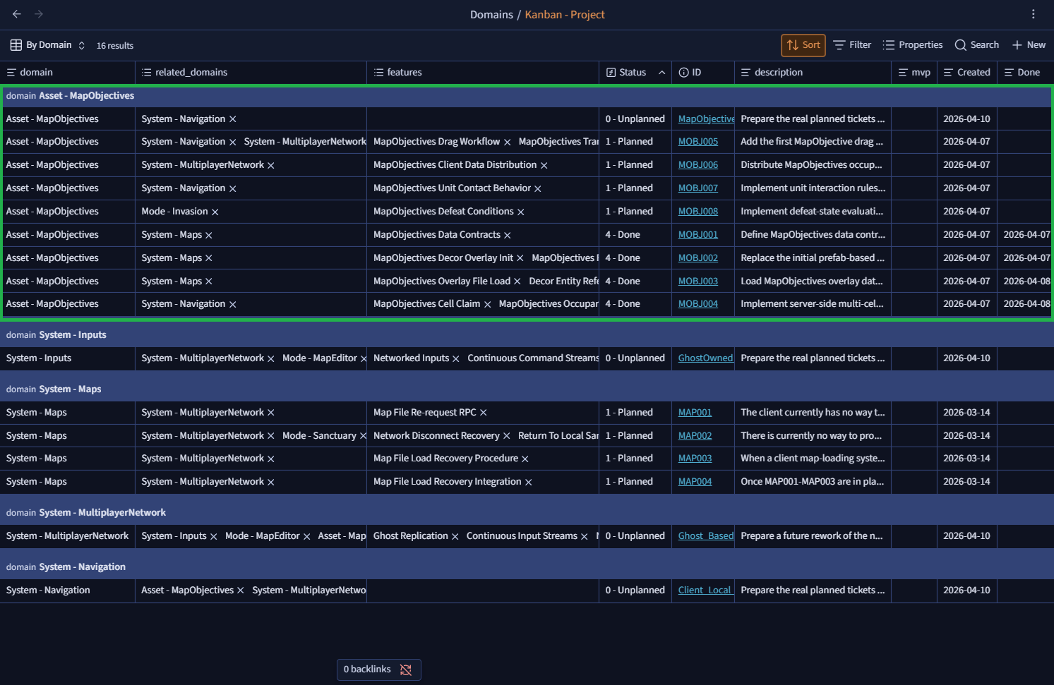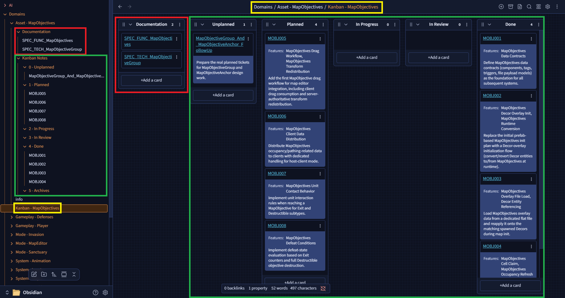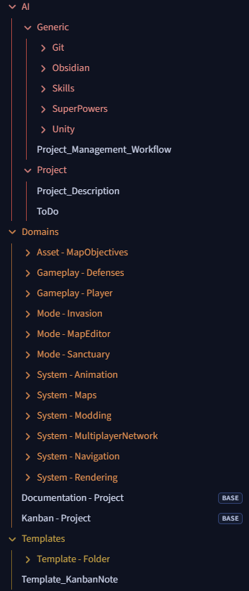 - un répertoire par domaine fonctionnel de mon jeu. Chaque répertoire porte sa documentation, un Kanban dédié et les notes associées aux tickets